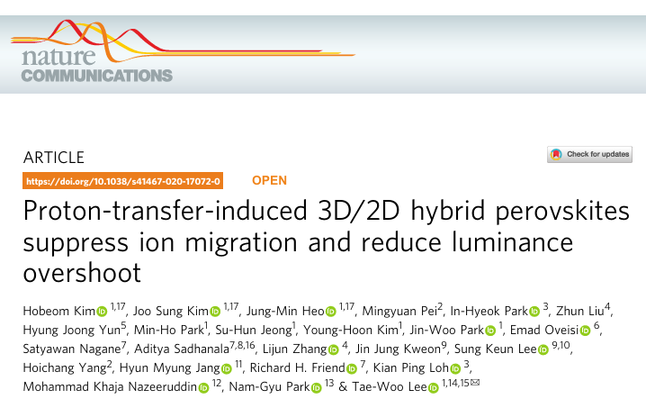 H. Kim†, J. S. Kim†, J.-M. Heo†, M. Pei, I.-H. Park, Z. Liu, H. J. Yun, M.-H. Park, S.-H. Jeong, Y.-H. Kim, J.-W. Park, E. Oveisi, S. Nagane, A. Sadhanala, L. Zhang, J. J. Kweon, S. K. Lee, H. Yang, H. M. Jang, R. H. Friend, K. P. Loh, M. K. Nazeeruddin, N.-G. Park, and Tae-Woo Lee*